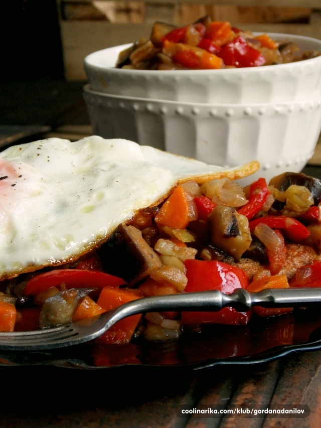 Zatim dodajte rajčice, paprike i patlidžane te dok kuha neprekidno miješajte i postepeno začinite po želji (sol,papar, crvena paprika..)